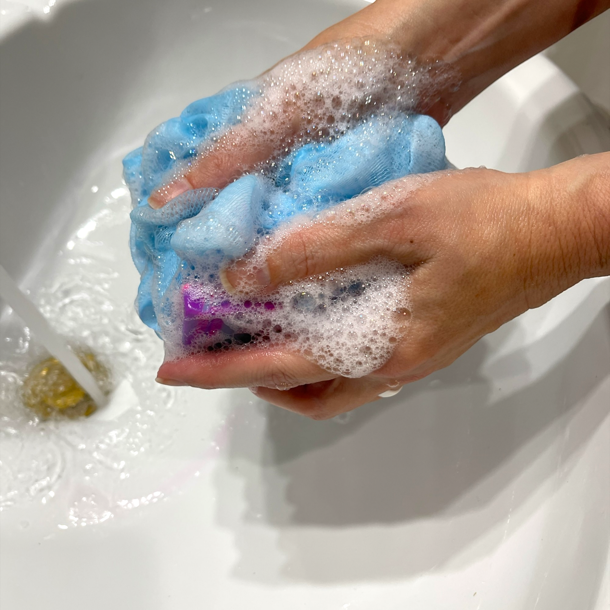 Mesh Pouf with Suction Cup Holder - a convenient and versatile addition to your shower routine. The mesh design creates a soft and exfoliating lather, while the suction cup holder keeps it in place for a hands-free experience. Enjoy a spa-like shower experience with this easy-to-use product. Pick your favorite color!